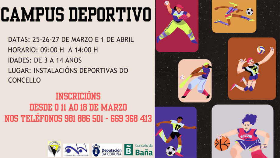 Este campus deportivo le ofrece la oportunidad a niñas y niños de disfrutar de una Semana Santa activa y saludable, participando en diversas actividades deportivas y lúdicas bajo la supervisión de monitorizado cualificado. Está organizado lo pones Ayuntamiento de A Baña en colaboración con la Sociedad Deportiva A Baña y con la Diputación de A Coruña.