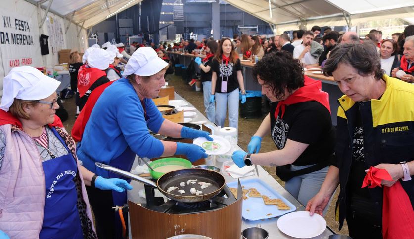 Unhas 30 cociñeiras, en quendas de 20 persoas, comezarán a preparar as tortillas de masa a partir do mediodía, que se poderán degustar gratuitamente na carpa con cada consumición ou comprar para levar en caixas de pizza (unha por 3 euros, dúas por 5 euros). Unhas compras que algunhas persoas fan para levalas á casa e outras para degustalas na área recreativa, que como todos os anos acollerá a centos de familias e grupos de amigos nas súas respectivas parcelas. A base das merendas é común para todas (ovos, auga e fariña), pero despois cada cociñeira daralle o seu toque persoal tanto polo grosor da tortilla, o seu tempo de cociñado ou por se as acompaña ou non de torriscos (láminas de touciño de porco).