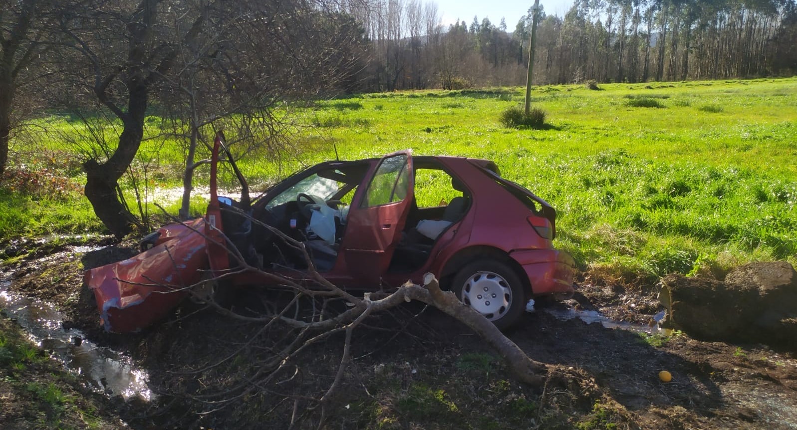 Un turismo Peugeot conducido por un mozo protagonizou unha aparatosa saída da vía quedando totalmente esnaquizado tras o impacto coa gabia e cunhas árbores ao marxe da estrada. O suceso producíase pasados uns minutos das doce do mediodía deste venres á altura do quilómetro 3,5 da estrada DP-1912 que une o núcleo de Coristanco coa DP-1914 en Rus, Carballo, preto da parroquia de Erbecedo. Por causas que se investigan, o condutor, e único ocupante do coche, perdeu o control do turismo e tras cruzar o carril contrario sentido Rus saíuse totalmente fóra da estrada e quedou atrapado e aturdido no seu interior, tendo que ser liberado polos Bombeiros de Carballo, pero por sorte as súas feridas non revestían gravidade, a pesares do estado no que quedaba o vehículo. Emerxencias mobilizaba tamén a Protección Civil e Policía Local de Coristanco e á Garda Civil de Tráfico.