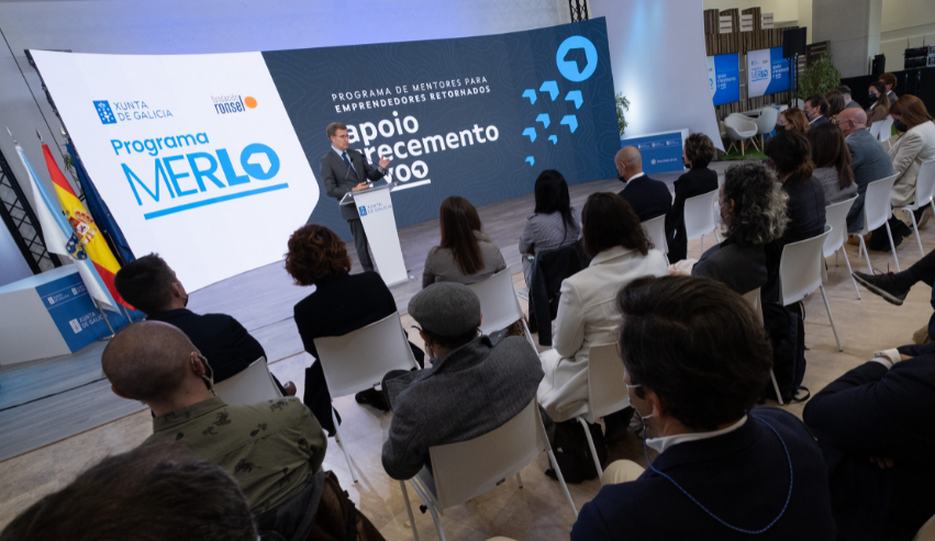 Durante o encontro Retorno Emprendedor: Programa Merlo, o presidente da Xunta, Alberto Núñez Feijóo, destacou que as axudas ao retorno emprendedor, que contan cada vez con máis demanda, impulsaron desde a súa posta en marcha máis de 500 proxectos, cunha mobilización de 25 millóns de euros.
