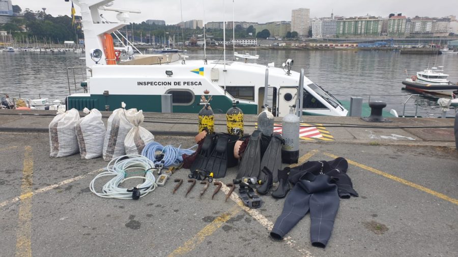 Tras unha minuciosa inspección pola zona os Gardas Civís atoparon detrás duns sacos de rede no espigón do porto, os traxes de mergullo cos que cometeran as infraccións.