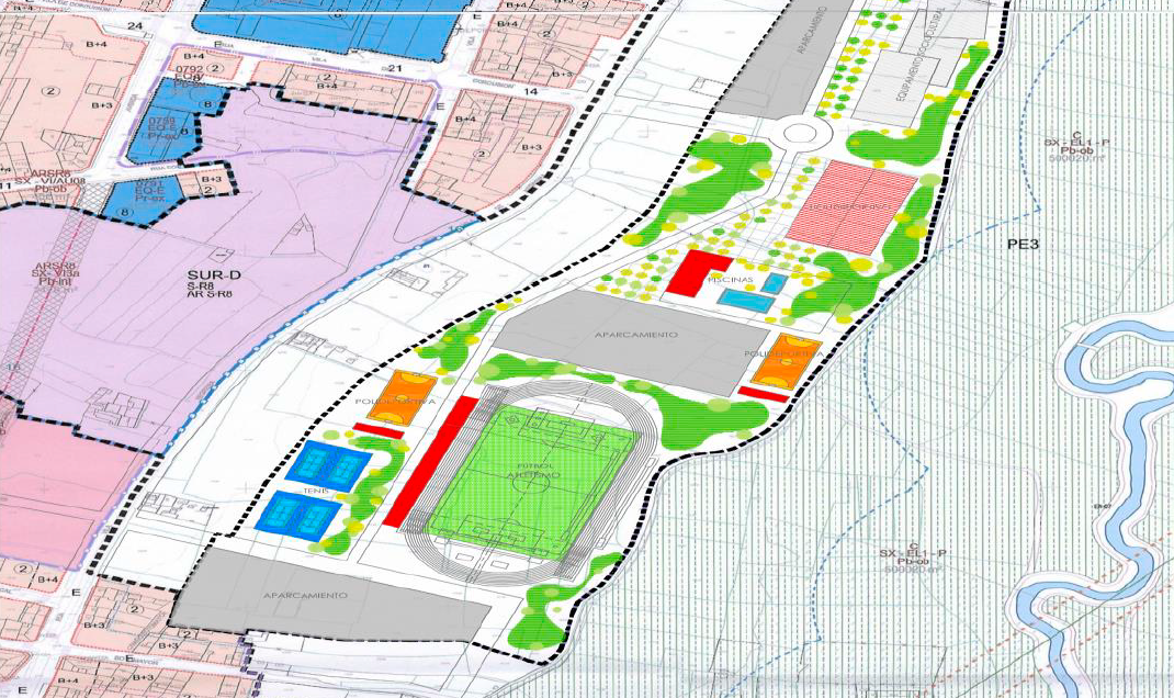 Propoñemos a delimitación dun ámbito de superficie aproximada de 108.600m2 para a ordenación dunha amplia área de dotacións deportivas e socioculturais colindante polo este co casco urbano de Carballo para dar os primeiros pasos dunha futura cidade deportiva