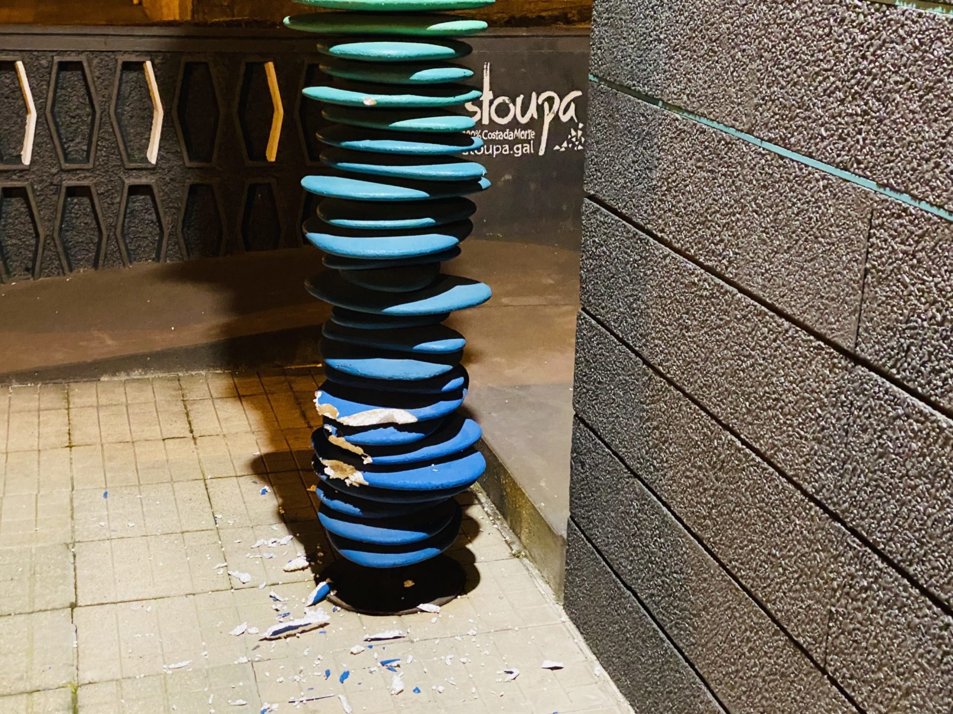Ni las intensas lluvias de este fin de semana ni las fuertes rachas de viento pudieron con la colorida escultura que preside la tienda Stoupa, situada en la villa de Cee. Sin embargo, este domingo la estructura sufrió varias roturas que, tal y como confirma la gerente del local, Begoña Fernández, “responden la estupidez humana de unos descerebrados”.