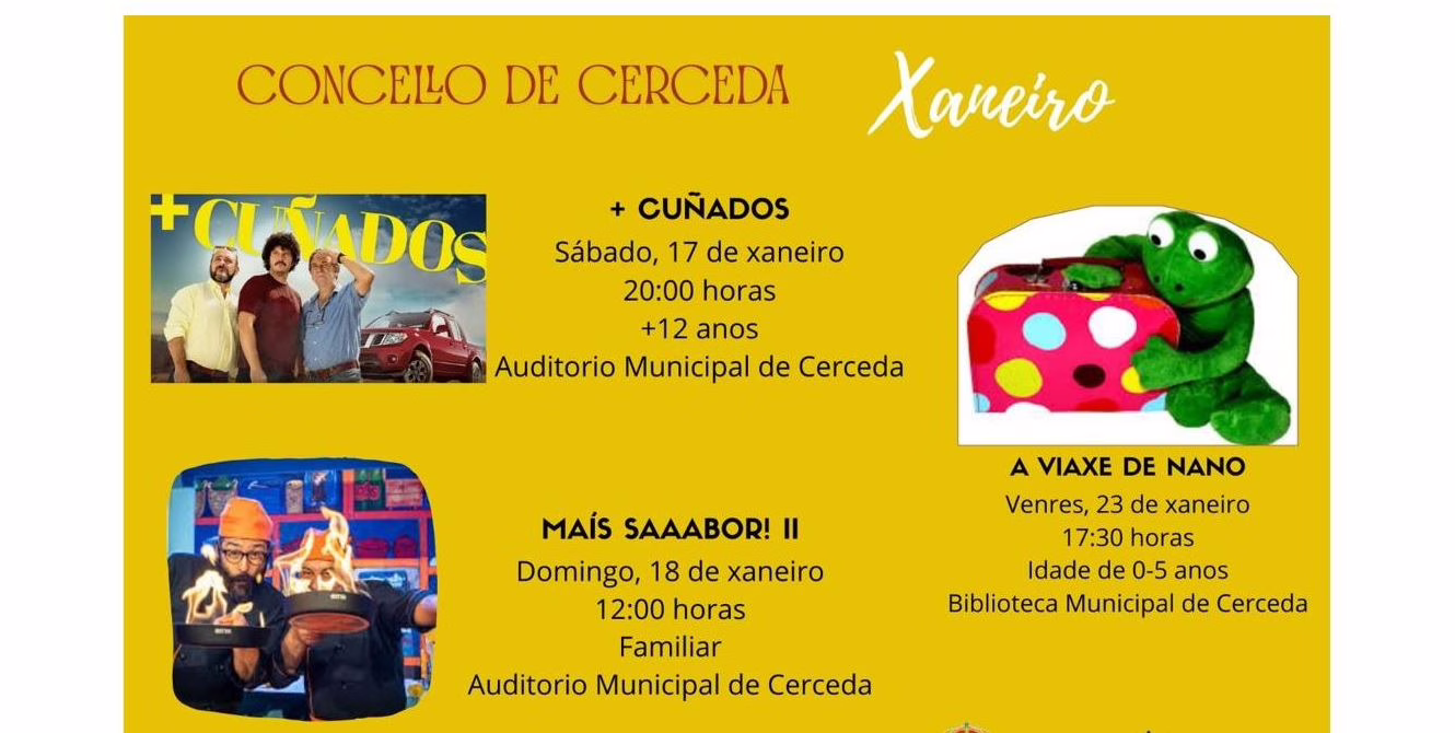 A programación arrincará o sábado 17 de xaneiro ás 20:00 horas no Auditorio de Cerceda coa proxección da película ‘+Cuñados’, unha comedia pensada para público maior de 12 anos. Ao día seguinte, o domingo 18 de xaneiro ás 12:00 horas, o Auditorio de Cerceda acollerá o espectáculo ‘Teatro con Máis Saaabor! II’, unha función de carácter familiar que combina humor e interpretación escénica, pensada para desfrutar en compañía de nenos e nenas.