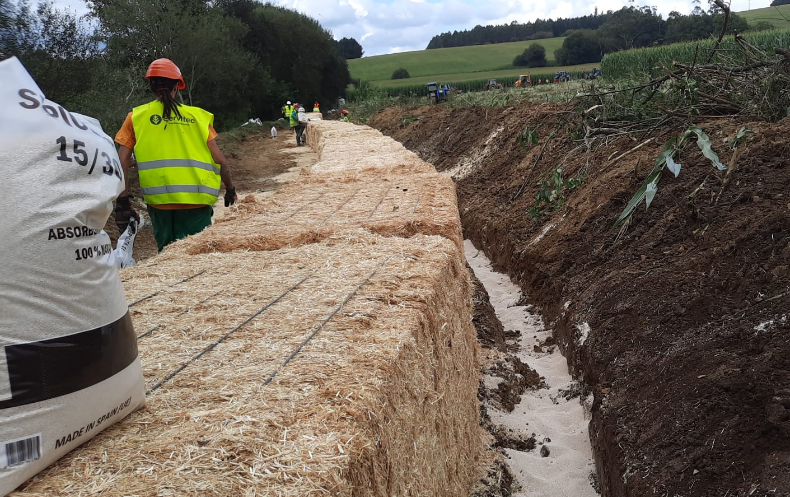 En el punto del vertido se está frenando el purín mediante zanjas de contención de 150 metros lineales con alpacas de gran tamaño y con sepiolita, que absorben el material contaminante y evitan las infiltraciones.
