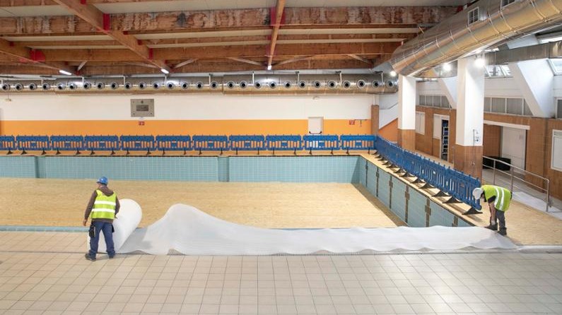 La concejal de Deportes, Mónica Martínez, informó en el transcurso de la comisión informativa de Deportes del inicio de las obras de reforma y rehabilitación de la cubierta de la piscina de Riazor. Los trabajos fueron adjudicados a Abeconsa por un importe de 253.792 euros y un plazo de ejecución de dos meses. Los trabajos consisten en la retirada de la estructura actual y la instalación de una nueva cubierta a un agua con pendiente del 10% realizada con panel sándwich sobre una estructura de madera laminada, manteniendo la inclinación hacia la fachada del Frontón. Además, se sustituyen las ventanas de la fachada sobre la bancada por unas nuevas, con carpintería de aluminio, que también contribuyen a la mejora de las condiciones térmicas del recinto.