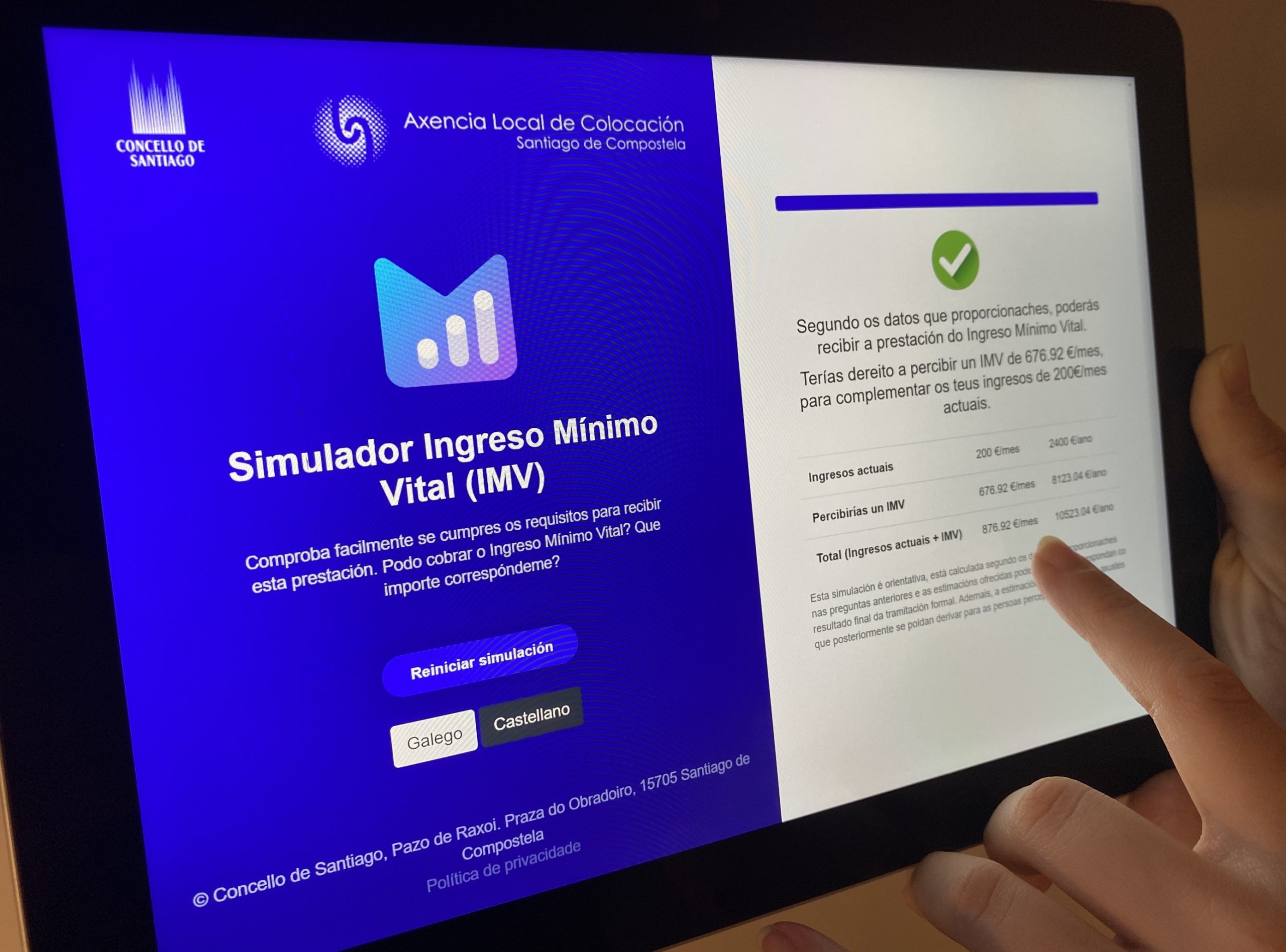 El área de Empleo del Ayuntamiento de Santiago está impulsando diversas medidas de consulta y apoyo para facilitar la información sobre esta prestación no contributiva a la ciudadanía más vulnerable de la ciudad. Así, este lunes, el alcalde de Santiago, Xosé Sánchez Bugallo, y el técnico municipal responsable de Empleo, Xavier Ferreiro, presentaron un simulador del Ingreso Mínimo Vital, que permite consultar de forma muy sencilla el cumplimiento de los requisitos para percibir esta prestación y mismo en que cuantía económica.