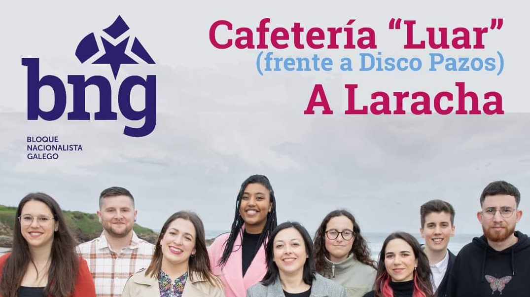 Este viernes 19 las 19:30h en la cafetería Luar el BNG de A Laracha va a tener un encuentro con la juventud de la localidad para escuchar las inquietudes de la gente joven y cuales son sus propuestas sobre cómo construir la Laracha del futuro. Acompañando a la candidata estarán también el número 2 de la candidatura Xosé Cotelo, y además, tomando el papel protagonista del encuentro, el número 3, David Bermúdez y a número 4 Estefanía Pombo, así como el resto de integrantes menores de 30 años.