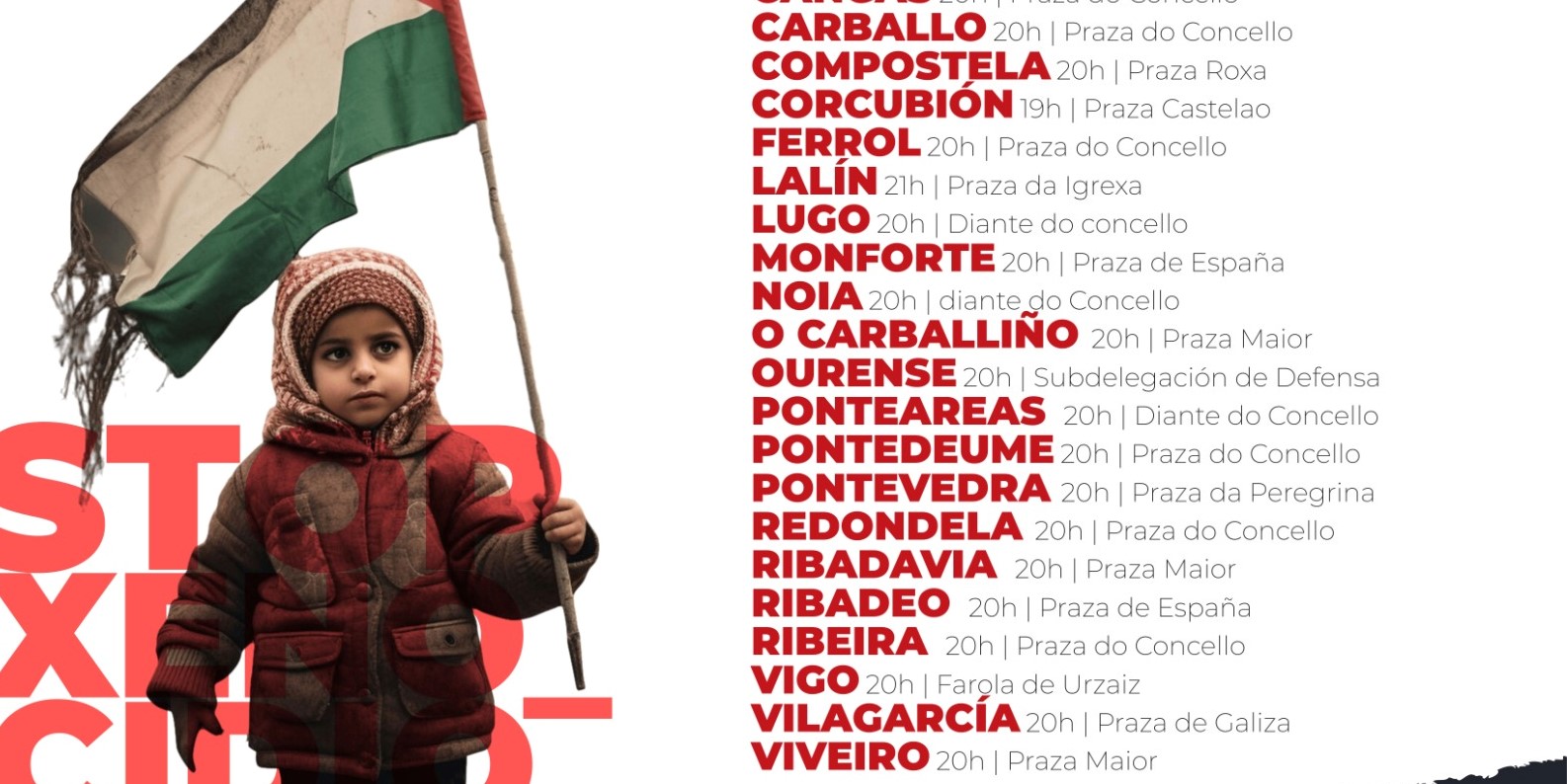 El BNG de Bergantiños secunda la concentración convocada por la Plataforma Galicia con Palestina, compuesta por diversos colectivos, para el lunes 13 de noviembre, con las siguientes características: