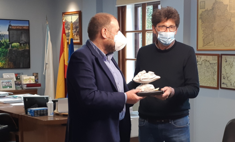 José Manuel Pequeño, alcalde de Dumbría, y Carlos González Patiño, Delegado regional Noroeste (Galicia y Asturias) de Red Eléctrica S.A.U., firmaron un convenio de colaboración para la promoción del Gran Fondo Ézaro Fin del Camino. El día 10 de julio se celebrará la 8ª edición de esta prueba, con la que Red Eléctrica viene colaborando desde su nacimiento. El alcalde le hizo entrega a González Patiño de una réplica de la Piedra Cabalgada del Brazal, escultura que fue empleada por primera vez en 2012 como trofeo de La Vuelta, que había tenido como final de etapa el mirador del Ézaro. También le entregó un ejemplar del libro “Monte Pindo. Historias y leyendas del Olimpo Celta, obra de la ilustradora Laura Suárez. Pequeño quiso reconocer la buena relación institucional existente con Red Eléctrica, con quien ya había firmado el pasado año un convenio para la renovación de los proyectores de la iluminación ornamental del acceso a la Cascada del Ézaro, con alumbrado de eficiencia energética, y la donación de ordenadores portátiles que esta empresa hizo a las aulas de informática municipales.