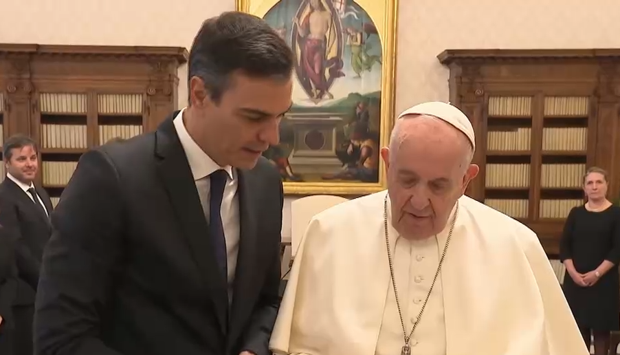 El Papa recibió a Pedro Sánchez en audiencia durante unos cuarenta minutos en su biblioteca particular, en la que hablaron de educación, migraciones y cambio climático. El Pontífice realizó una intervención pública de varios minutos, algo infrecuente en estos casos. Acompañaban a Sánchez su esposa y la embajadora española en la Santa Sede, Carmen de la Peña. El pontífice dijo que la patria debe ser territorio “del derecho y de la justicia” y se refirió a cuál ha ser el objetivo de los políticos:”Construir la patria es lo que yo diría en este caso. Si para el país hacerlo progresar, con la nación consolidarla y con la patria tenemos que construir… construir la patria con todos”. El Papa Francisco habló del ascenso del nazismo a partir del año 1933 y alertó sobre el drama de las patrias inventadas por una ideología:”Las ideologías sectarizan, las ideologías desconstrúyen la patria, no construyen. Aprender de la historia” Finalizó el Pontífice señalando literalmente que “es muy triste cuando las ideologías se apoderan de la interpretación de una nación o de un país”.