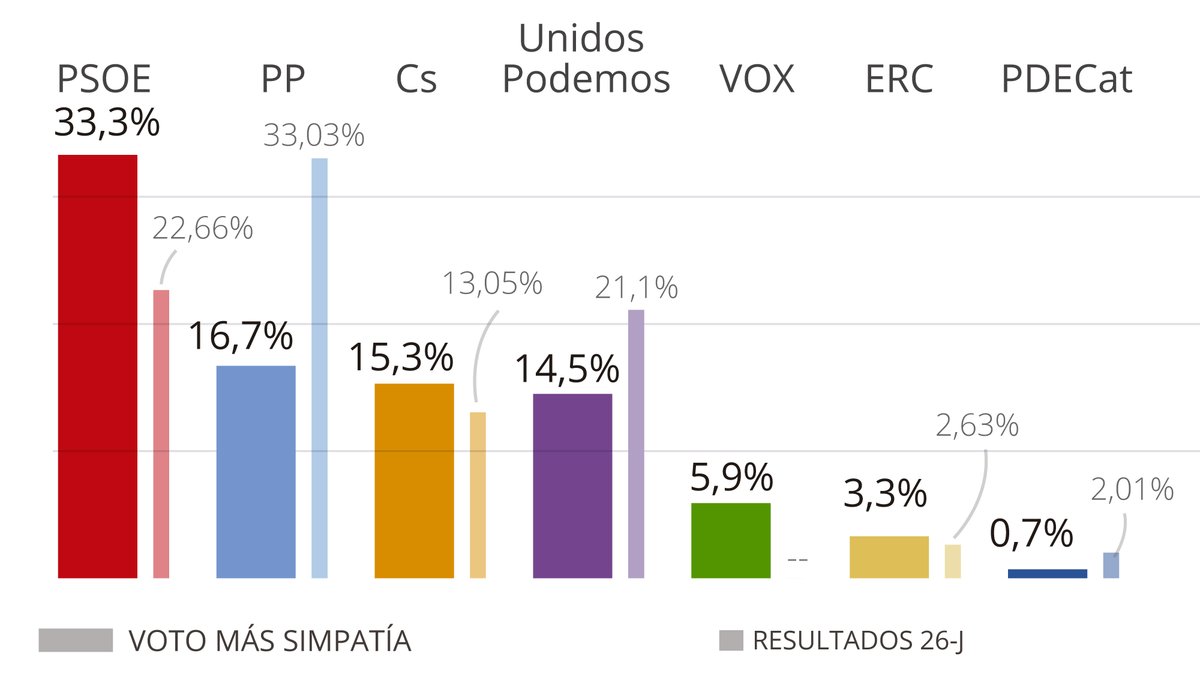 De celebrarse eleccións xerais o PSOE sería o partido máis votado cun 33,3 por cento dos apoios,superando a PP e a Cs xuntos, que quedarían cun 16,7 e 15,3 por cento respectivamente, segundo a enquisa de febreiro do CIS, que disparou a vantaxe dos socialistas.