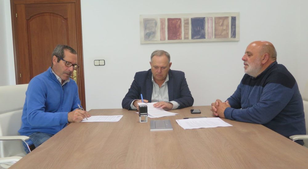 O alcalde, José Manuel López Varela, e Manuel Amado Souto en representación da empresa larachesa que é a nova concesionaria do servizo de mantemento das zonas verdes públicas, formalizaron este luns o contrato que entrou en vigor este martes.