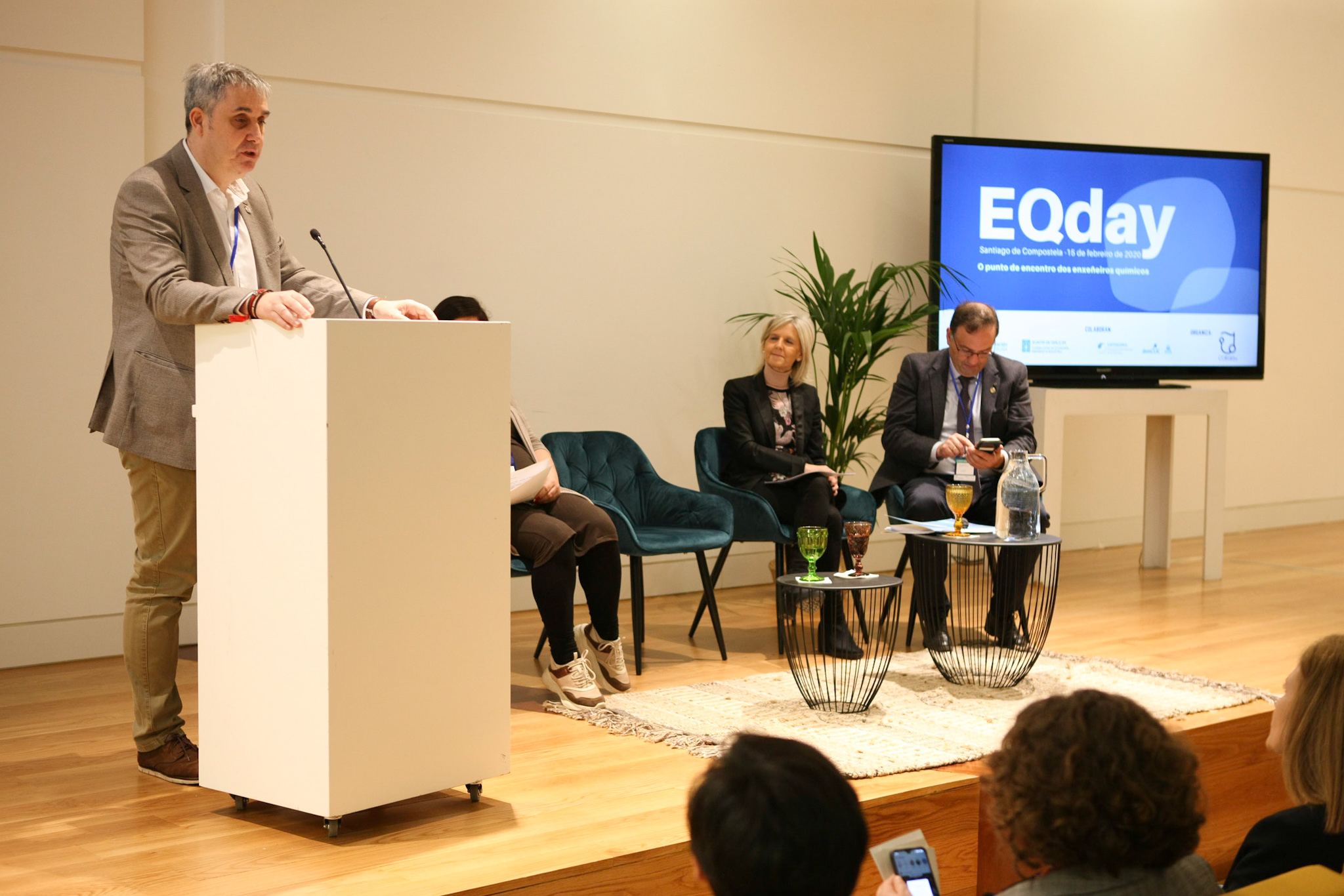 La Cidade da Cultura de Santiago acogió este sábado la primera edición de EQday, un evento puesto en marcha por el Colegio de Ingenieras e Ingenieros Químicos de Galicia (COEQGa). En la jornada se puso de manifiesto el valor de la profesión del ingeniero/a químico/a y su importancia en el tejido industrial. El evento fue inaugurado por el diputado responsable del área de Promoción Económica de la Diputación de A Coruña, Blas García, la secretaria general de Empleo de la Xunta de Galicia, Covadonga Toca, el vicerrector de Planificación y Proyección Estratégica de la USC, Gumersindo Feijóo, y la presidenta del COEQGa, Andrea Fernández. El EQDay quiere rendir homenaje a los 25 años del inicio de los estudios de Ingeniería Química en la Universidad de Santiago de Compostela. Esta trayectoria permite tener una cantera de ingenieras e ingenieros químicos gallegos trabajando en las empresas más punteras a nivel autonómico, nacional e internacional. Así, por las aulas de la USC, pasaron estudiantes que ahora ocupan cargos de responsabilidad en empresas como Inditex, Repsol, Grupo Calvo, Ferroaltántica, Arcelor Mittal, Procter&Gamble, Air Products, Iberdrola, entre otras.