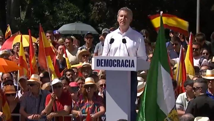 Entre gritos de «Sánchez, dimisión» y «presidente, presidente», el líder de PP, Alberto Núñez Feijóo, ha dicho este domingo que España está «cansada, pero no rendida» frente a un presidente que se «esconde», «miente» y «huye». «España —considera— necesita una revolución, la revolución de la decencia y de la libertad. Lo hizo en una manifestación en Madrid a la que según la Delegación del Gobierno habrían asistido una 50 mil personas. Esta ha sido ya la sexta manifestación convocada por el Partido Popular contra el Gobierno de Pedro Sánchez. Bajo el lema «mafia o democracia», la concentración ha arrancado a las 11.00 horas en la Plaza de España. En el acto también ha hablado la presidenta madrileña, Isabel Díaz Ayuso, que ha calificado al Gobierno de «corrupto». «La herencia de Sánchez la vamos a pagar por décadas. Tiene que llegar a su fin, depende de todos los que estamos aquí», ha concluido. Para el PSOE, la manifestación ha sido un «pinchazo» y que la «respuesta en la calle a su estrategia ha sido raquítica». La formación socialista ha tildado a Feijóo de «fracaso» y que los españoles «no soportan más esta forma de hacer política del PP».