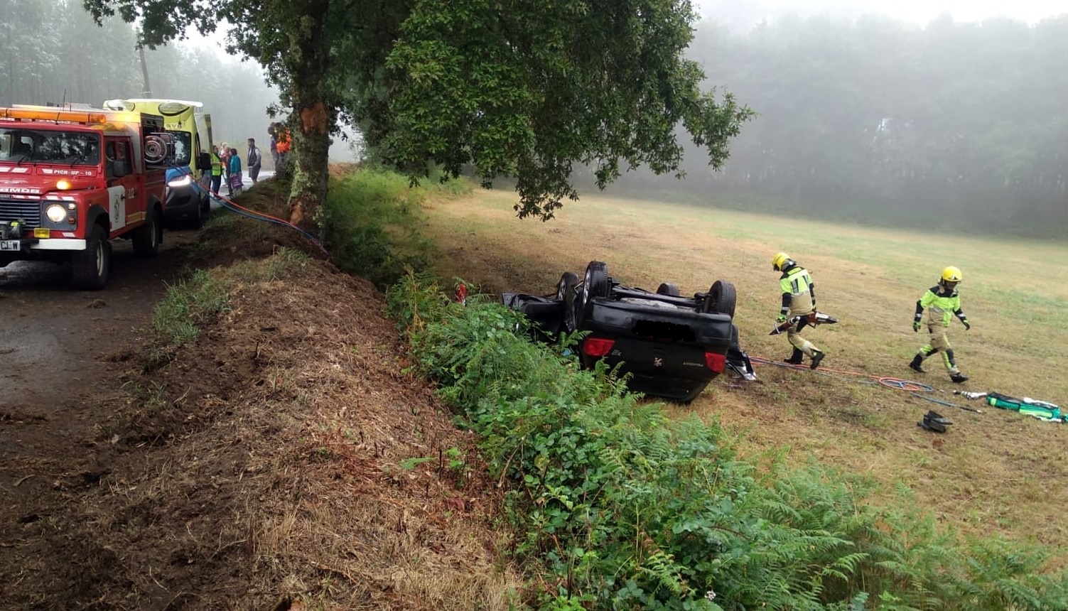Ás 10 da mañá deste mércores o 112 Emerxencias Galicia pasaba un aviso por un accidente cunha persoa atrapada na estrada de San Salvador, en Santa Comba. Ao punto foron derivados de urxencia os Bombeiros do Xallas, unha Ambulancia do 061, Policía Local e Protección Civil de Santa Comba, así como a Garda Civil de Tráfico. Unha vez no lugar puideron comprobar que se trataba dunha saída de vía dun turismo Peugeot, que estaba volcado sobre o teito nunha finca paralela á estrada e co seu condutor atrapado no interior. Tras ser liberada, a persoa foi atendida polos servizos médicos e trasladada en ambulancia ao Complexo Hospitalario Universitario de Santiago de Compostela.
