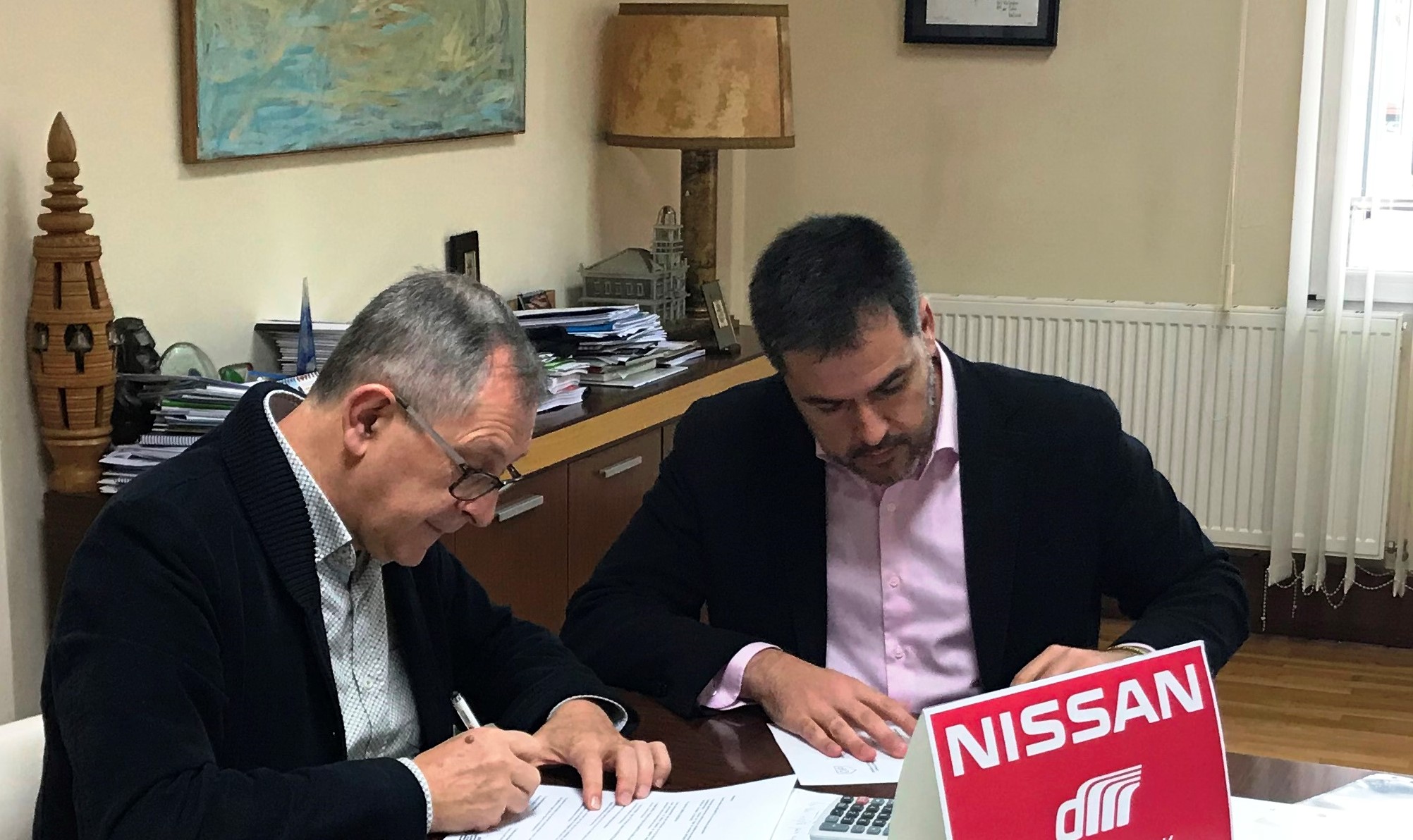 Evencio Ferrero, en representación del Ayuntamiento de Carballo, y Marcos Díaz, de Nissan Antamotor, firmaron un convenio de colaboración para el V Festival Carballo Interplay. El concesionario, acercará dos coches que serán utilizados como vehículos oficiales del festival entre los días 2 y 8 de este mes de abril.