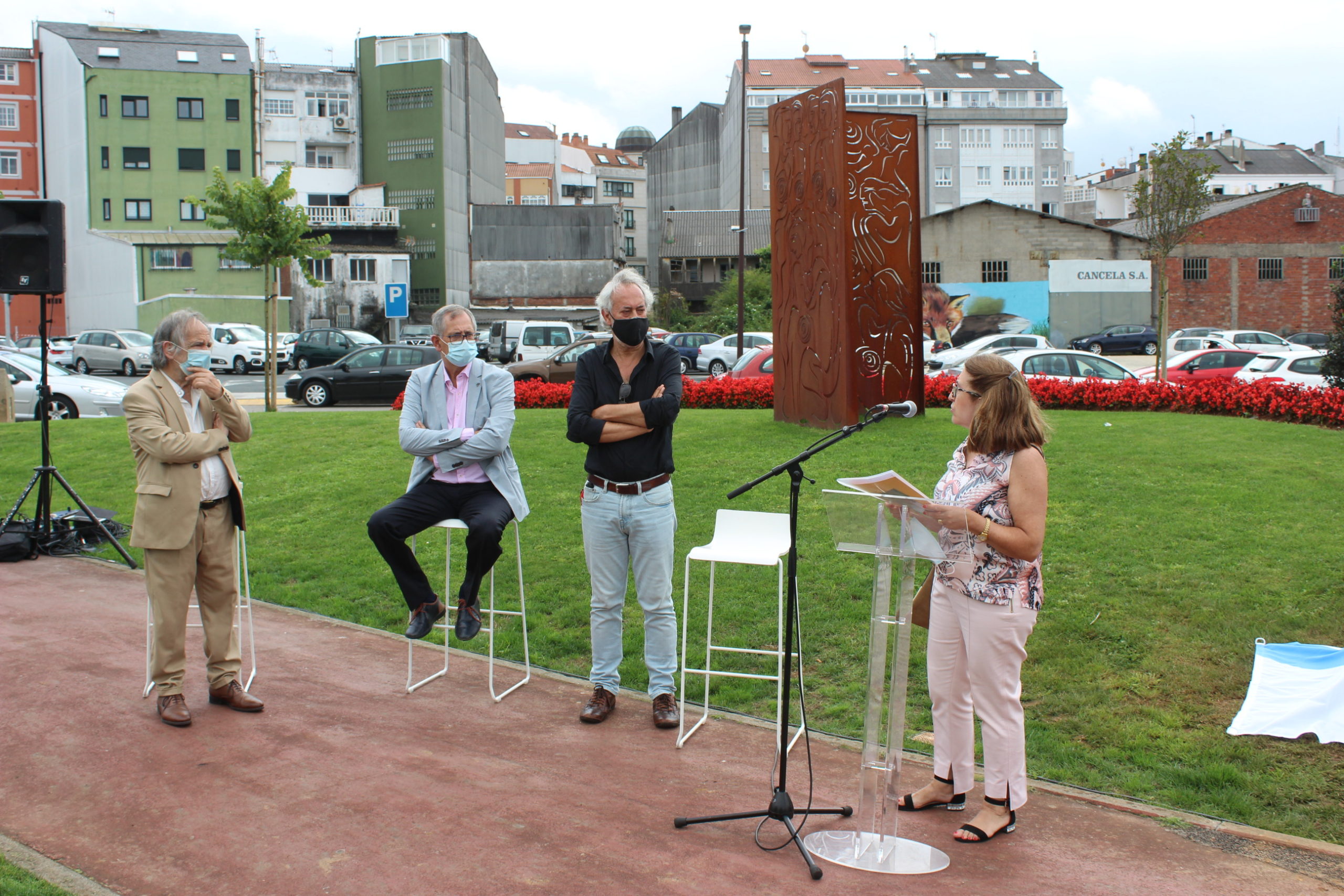 - Acisclo Manzano, el prestigioso artista ourensano que firma la escultura, participó en el acto organizado por el Ayuntamiento con la colaboración de la Agrupación Cultural Lumieira