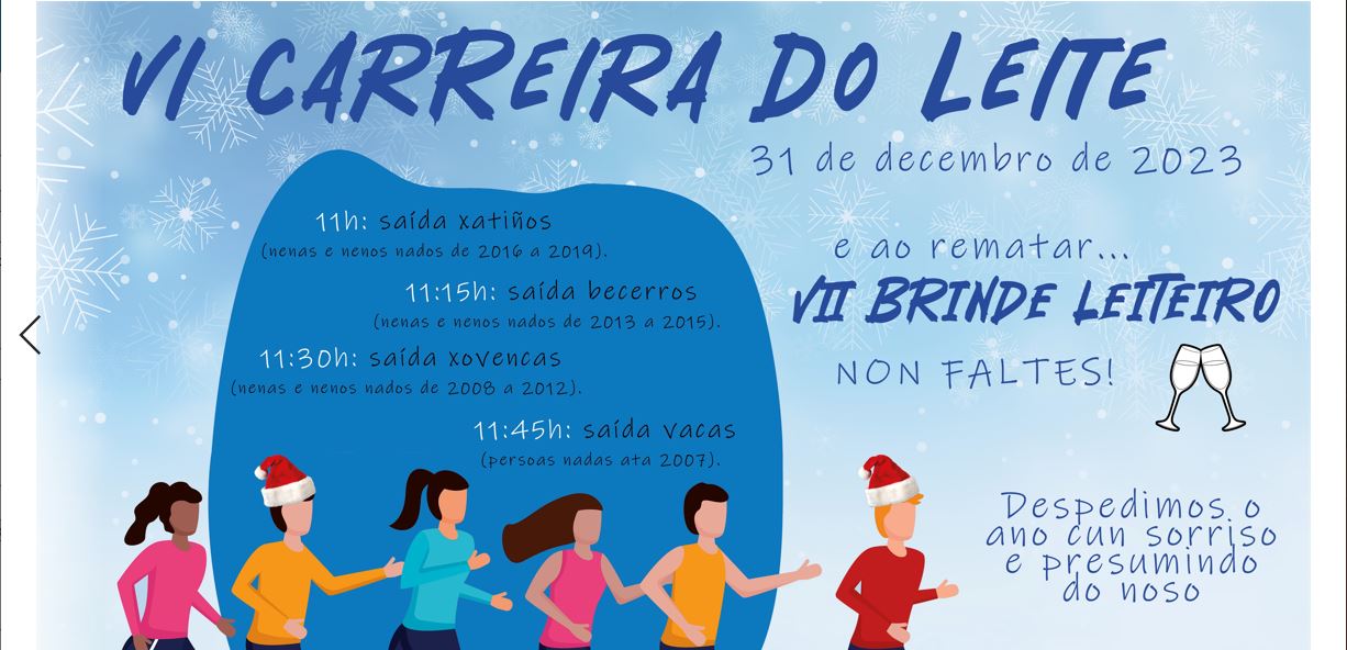 El 31 de diciembre se celebra la ya emblemática Carreira do Leite de Mazaricos, que alcanza su sexta edición. Corredores de todas las edades pondrán el broche al año con una carrera donde prima la diversión y donde la organización anima un año más a utilizar disfraces y adornos. La carrera, con cuatro categorías de edad, comienza a las 11 de la mañana en la Picota y las inscripciones ya si encuentran abiertas online. Cuando final, se celebrará el VII Brindis Lechero de Mazaricos, donde está invitado todo el vecindario. Se trata de una celebración de despedida del año y exaltación del producto más singular de Mazaricos: su leche.