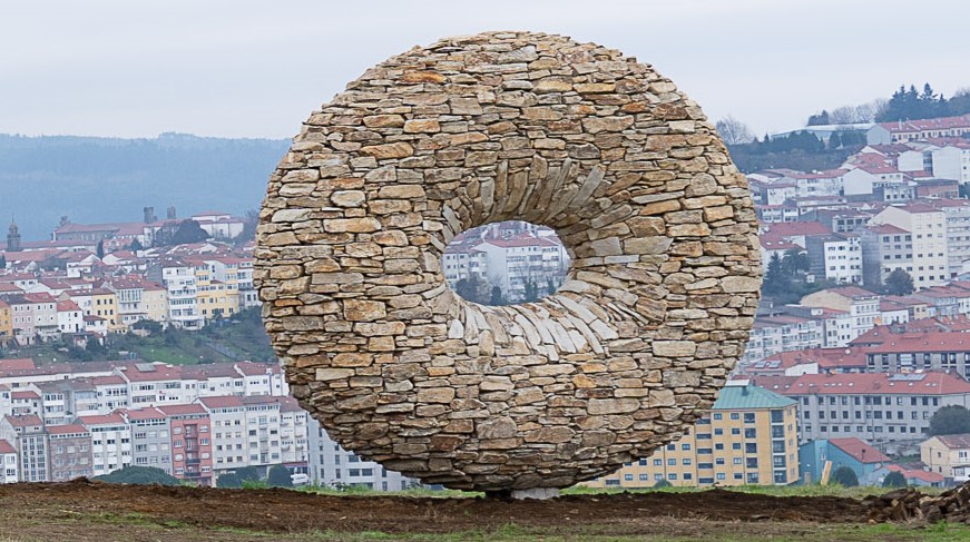 En esta conexión, el artista también precisó que la construcción en piedra —obtenida de la cantería compostelana de Lamas de Abade— remite ex profeso a los numerosos muros de los senderos interiores de las diferentes Rutas Xacobeas y como apostó por el doble arco —tan característico del románico y tan presente en el arte del Camino— para construir la apertura ocular interior desde la que se encuadra el visionado de la Catedral.