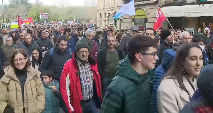 Miles de personas protagonizaron este domingo en Santiago una protesta en la que se notaba la tensión electoral y el recuerdo de la crisis del Prestige, gestionada con incompetencia por la administración del PP hace ahora más de veinte años. Más de 7.500 personas, según la delegación del Gobierno, partieron de la Alameda compostelana y concluyeron en la Praza do Obradoiro, asistieron numerosos cargos políticos de fuerzas progresistas, como la vicepresidenta segunda del Gobierno y líder de Sumar, Yolanda Díaz, y la exministra de Igualdad Irene Montero. También estaban presentes candidatos y candidatas que aspiran a presidir el Gobierno gallego a partir del 18 de febrero, como Ana Pontón (BNG), Xosé Ramón Gómez Besteiro (PSdeG), Marta Lois (Sumar) e Isabel Faraldo (Podemos).