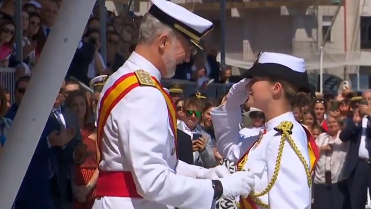 El rey Felipe VI ha entregado la distinción a su hija, ante la atenta mirada de su madre, la reina Letizia, y su hermana, la infanta Sofía: una banda con los colores de la bandera de España, igual que la que lleva su padre, y una placa en la insignia de la solapa. La princesa ha recibido además la felicitación de su padre con un abrazo y solo unos instantes después ha comenzado a sonar la salve marinera. Los guardiamarinas, entre ellos la princesa, desfilaron uno a uno ante el palco donde se encontraban los reyes, que presidieron el juramento o promesa ante la bandera y recogieron el real despacho de empleo. En su discurso, el comandante Pedro Cardona, director de la Escuela Naval, ha expresado su «orgullo» al ver a «una familia más» de la Armada, la Familia Real, «sobrellevar la distancia y celebrar el reencuentro» en un año emocionante. El homenaje a todos los soldados caídos por España y el himno de la Armada han cerrado este acto emotivo en el que también ha estado la ministra de Defensa, Margarita Robles.