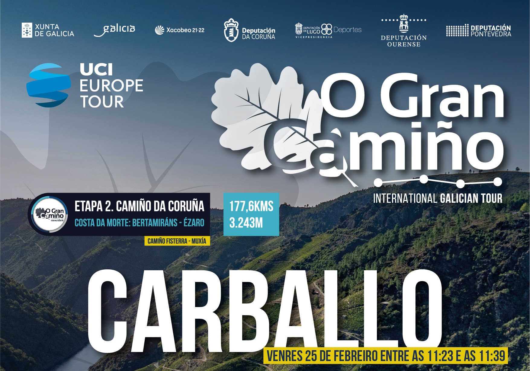 La vuelta ciclista O Gran Camiño pasará este viernes por Carballo, donde se disputará una meta volante de la etapa Costa da Morte: Bertamiráns-O Ézaro. El paso del pelotón por la villa bergantiñana está previsto de 12:23 a 12:38 horas con el siguiente recorrido: avenida de Fisterra, calles Alexandre Bóveda, Luis Calvo (donde estará ubicada la meta volante), Poñente, Fábrica y avenida de Malpica.