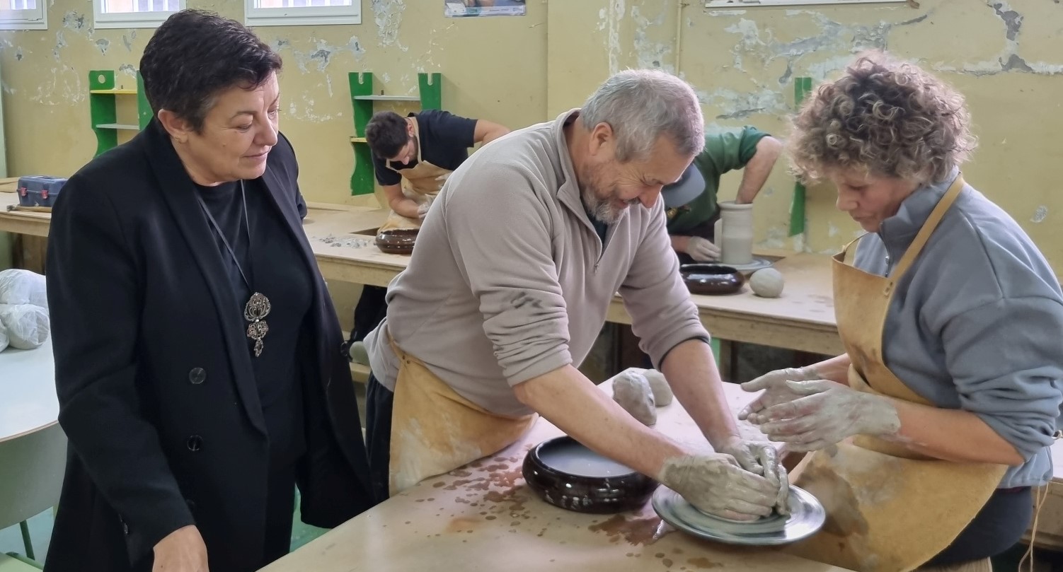 La gerente de la Fundación Artesanía de Galicia, Elena Fabeiro, visitó el curso de formación especializada Formas tradicionales de la alfarería de Buño, que imparte el ollero Antonio Pereira “O Rulo” en Buño (Malpica de Bergantiños), con el objetivo de transmitirle a otros profesionales del sector el oficio de la alfarería tradicional de esta localidad de A Costa da Morte, que es uno de los cuatro centros de alfarería tradicional aún activos en Galicia y el que cuenta también con un mayor número de oleiros profesionales.