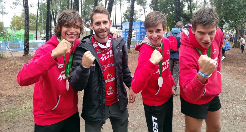 Este sábado, 7 de los triatletas de la AD.Fogar tomaron parte en el Campeonato de España de Ácuatlon que se desputaba en el centro de innovación tecnológica sobre el deporte, en Extremadura; en una quíntupla cita histórica con tres títulos nacionales en juego, los de Ácuatlon, Duatlón Cross y Triatlón Cross, y dos títulos mundiales, los de Triatlón Cross y Acuatlón, que pondrán en competición este fin de semana a 2.190 participantes procedentes de todo el mundo. Y como de costumbre los de Carballo y Oleiros volvieron a brillar entre los mejores del panorama nacional; los juveniles con Pedro López 6º, Xabier Guitián 10º y Rubén Otero 22º subieron al más alto del cajón como Campeones de España por equipos de su categoría, los cadetes con Hugo Souto 19º, Álvaro Díaz 27º y Ángel Bello 44º fueron 4º a tan sólo un segundo del bronce, y en la categoría júnior David Sancho que volvía a competir luego de una larga lesión terminaba en una meritoria 17ª posición.