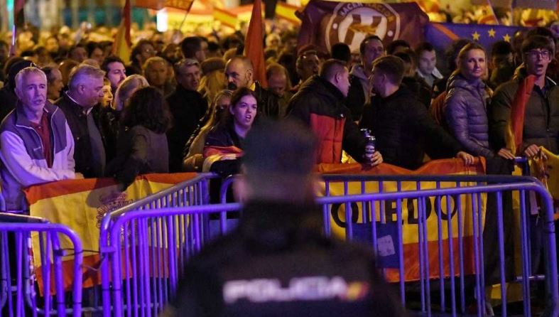 De nuevo en la calle Ferraz un grupo de manifestantes estubo agitando las vallas de seguridad a última hora de la tarde de este sábado. Los antidisturbios prepararon los escudos y sobre la zona sobrevolaba un helicóptero. Comenzaron a avanzar y cargar los agentes hacia los manifestantes, que habían tirado las vallas del cordón perimetral. Por megafonía la Pilicía avisa a los manifestantes que se alejen de la línea policial y cesen su actitud violenta. Tras no desistir y el aumento de la tensión por el lanzamiento de petardos y objetos como botellas de plástico y de vidrio a los agentes. La Policía ha procedido a cargar y ha comenzado a disparar pelotas de goma. Antes, ante la actitud de los manifestantes más radicales, la Policía ha retrocedido los furgones cinco metros cuando las vallas aún estaban en pie para evitar que los objetos las alcanzasen. La cifra de manifestantes ya ha bajado considerablemente este sábado en Ferraz y se cifra en 1.700 personas, según datos de la Delegación del Gobierno.