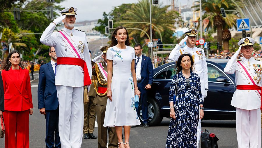 Felipe y Leticia han presidido este sábado en Santa Cruz de Tenerife el desfile del Día de las Fuerzas Armadas (DIFAS), en el que han participado 3.266 integrantes de los tres ejércitos, la Unidad Militar de Emergencias (UME), la Guardia Real y la Guardia Civil, y que ha sido seguido de cerca por miles de ciudadanos. Al acto ambién han asistido la ministra de Defensa, Margarita Robles; el ministro del Interior, Fernando Grande-Marlaska; el presidente de Canarias, Fernando Clavijo, el jefe de Estado Mayor de la Defensa (JEMAD), almirante general Teodoro Esteban López Calderón; el alcalde de Santa Cruz de Tenerife, José Manuel Bermúdez, y la directora de la Guardia Civil, Mercedes González. Miles de ciudadanos han acudido a ver el desfile del DIFAS, pues la expectación ha sido enorme porque, como comentaban los tinerfeños, hacía mucho que no podían ver a las Fuerzas Armadas en la isla. Uno de los actos más vistosos del acto de este sábado ha sido cuando la Patrulla Acrobática de Paracaidismo del Ejército del Aire y del Espacio (PAPEA) ha saltado con la bandera nacional, que cumple este año 240 años, y con la bandera del 10º Aniversario de la proclamación de Felipe VI como rey.