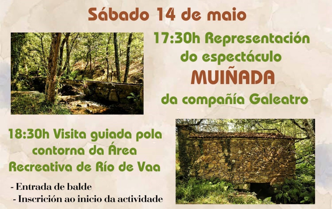 Tras ser aplazado en el mes de abril debido al mal tiempo, el espectáculo Muiñada ya tiene fecha: sábado 14, en el río de Vaa. Esta obra de teatro, organizada por el Ayuntamiento de Malpica, está dirigida a un público familiar que podrá disfrutar de juegos, leyendas, tradiciones y música en medio de la naturaleza.