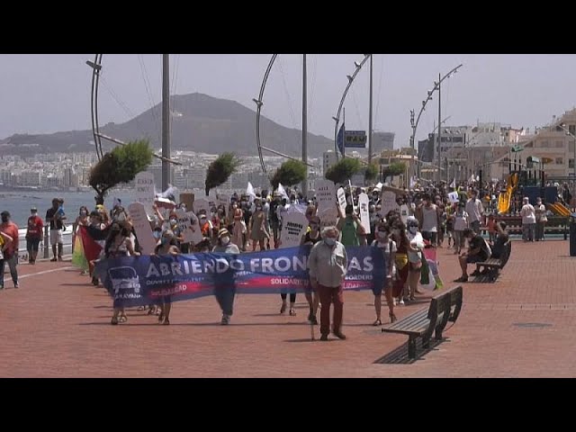Varios centenares de membros da asociación de defensa dos migrantes Abrindo Fronteiras reclaman un trato humano para os africanos que chegan en pateras ás illas Canarias. A rede de apoio nacida en Grecia en 2016 percorre as Illas Canarias para visitar lugares críticos da crise migratoria europea Antes de desembarcar en Tenerife fixérono en Agüimes na illa de Gran Canaria e no porto de Arguineguín. Visitaron o cemiterio da localidade onde son enterrados os migrantes mortos sen nome. Co control do Mediterráneo no norte de África os novos fluxos migratorios tenden a incrementarse con roteiros desde a costa oeste africana, polo Atlántico cara a Canarias.