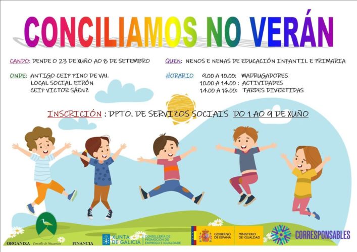 Este jueves, 1 de junio, abrió el plazo de inscripción del programa “Conciliamos no verán”, dirigido a familias con niñas y niños de infantil o primaria del ayuntamiento. Este programa sustituye así los campamentos de verano, procurando poder ofertar un servicio más completo para las familias que precisen conciliar la vida laboral y familiar en esta época no lectiva. Por eso, el programa se realizará entre el 23 de junio y el 8 de septiembre. En Mazaricos, este programa tendrá lugar simultáneamente en 3 locales públicos: el local social de Eirón, el antiguo CEIP Pendiente de Valle y el CEIP Víctor Sáenz. El horario será de 9h a 10h los Madrugadores, de 10h a 14h las Actividades y de 14h a 16h las Tardes Divertidas. Para inscribirse, las familias deberán acudir el departamento de Servicios Sociales hasta el 9 de junio.