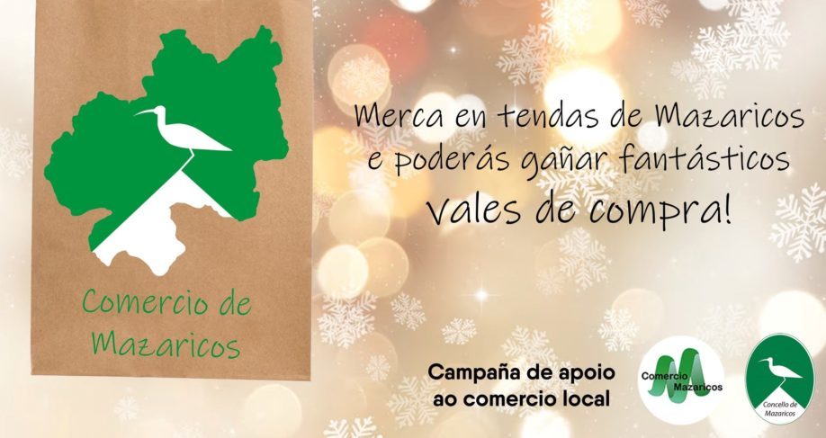 El Ayuntamiento de Mazaricos, en colaboración con los comercios de la localidad, lanza durante estas fiestas de Navidad y Reyes una campaña de promoción e incentivo del comercio local. Consistirá en el reparto, entre los clientes de los distintos establecimientos, de boletos tipo “rasca y gana”. Los premios consistirán en valles de compra, por valor de 10 euros, en los establecimientos adheridos a la promoción, que colaboran acercando estos premios. También habrá cuatro premios de vales de 50€ acercados por el Ayuntamiento. Los clientes recibirán los boletos con su compra.