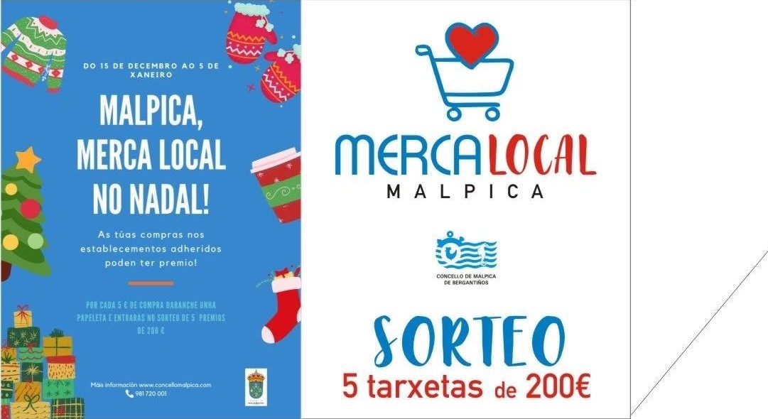 Trátase dunha campaña posta en marcha polo Concello de Malpica de Bergantiños. Baixo o nome «Merca Local no Nadal», un total de 81 comercios e hostaleiros do municipio participan nesta iniciativa que ten como obxectivo axudar a dous dos sectores máis golpeados pola Covid-19. Se compras nos comercios que teñen unha caixa, non dúbides en pedir o teu boleto para participar no sorteo de cinco tarxetas de 200€.