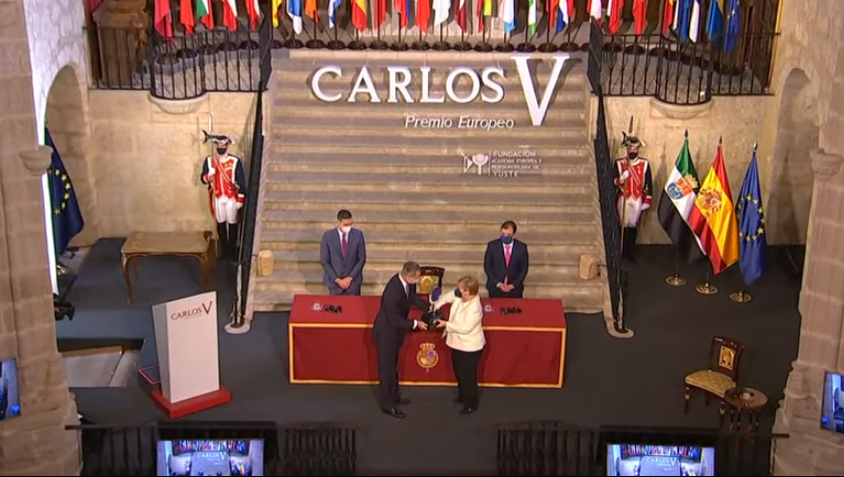 A chanceler alemá Angela Merkel foi galardoada co premio europeo Carlos V da Fundación Yuste pola súa longa traxectoria política ao servizo de Europa.