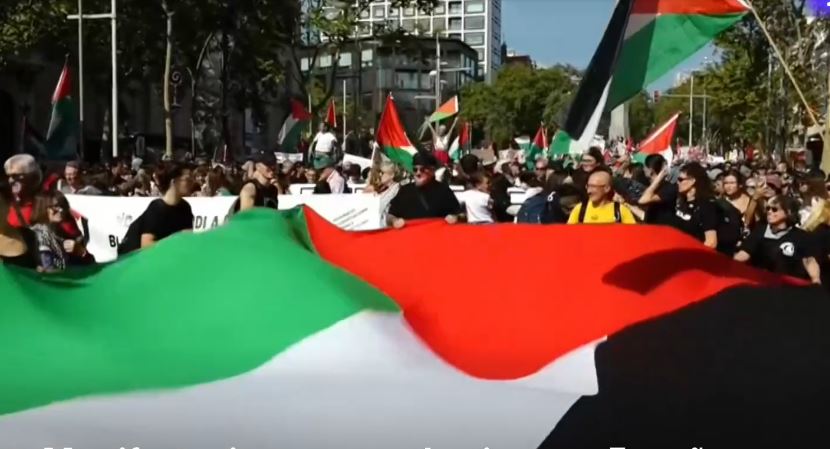 Unhas 70.000 persoas, segundo a Garda Urbana —300.000 segundo os organizadores—, pediron este sábado en Barcelona o fin do «xenocidio» israelí en Gaza e clamaron contra a abordaxe da Global Sumud Flotilla. A mobilización partiu dos Jardinets de Gràcia ás 12.00 horas e foi convocada por máis de 600 entidades, sindicatos e organizacións. Despois, os manifestantes desprazáronse ao Arc de Triomf e chegarán a Drassanes, onde hai unha acampada que se manterá, polo menos, ata a folga do 15 de outubro. A presidenta da Comunidade Palestina de Cataluña, Natàlia Abu-Sharar, denunciou que se fale de «plan de paz» para Gaza por Estados Unidos, «cando se trata dunha tapadeira para seguir asasinando o pobo palestino». Tamén Pablo Castela, da flotilla interceptada por Israel, denunciou que os tripulantes detidos non están a ter «o acceso á asistencia letrada adecuada». As manifestacións estendéronse tamén a outros lugares como Pamplona, Sevilla, A Toja, Cantabria, Canarias ou Madrid.