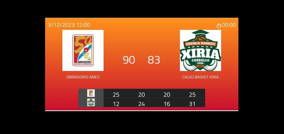 O Calvo Basket Xiria volveu a perder este domingo tras caer a domicilio co Obradoiro Ames na mañá deste domingo. Os de Héctor Méndez comezaron mal e reaccionaron tarde ante o seu rival chegando ao ecuador do partido perdendo de 9 puntos, 45-36. Tras a continuación, máis do mesmo, o Xiria estaba espeso e non reaccionaría ata entrado o último cuarto, onde se foron superiores ao conxunto local en xogo e resultado, pero xa non sería suficiente para o cómputo global que vencían os locais de 7, 90-83. Rubén Rey volveu a destacar como xogador Calvo da xornada con 21 puntos e 12 rebores en 39 minutos. Tócalle pasar páxina ao Calvo Basket Xiria e seguir traballando para mellorar algunhas fases do xogo, coa cabeza posta xa no próximo partido na casa fronte ao Culleredo.
