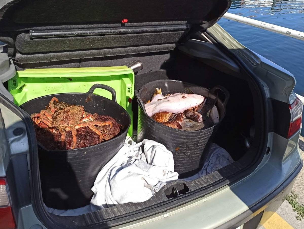 Durante la inspección se intervinieron dos capachos: uno con 30 piezas de centolla (27.350 kg) y otro con diversos pescados (brujas, rayas o maragotas), arrojando un peso total de 37 kilos. Las personas identificadas por las autoridades carecían de la documentación pertinente para el transporte por carretera de estos animales.