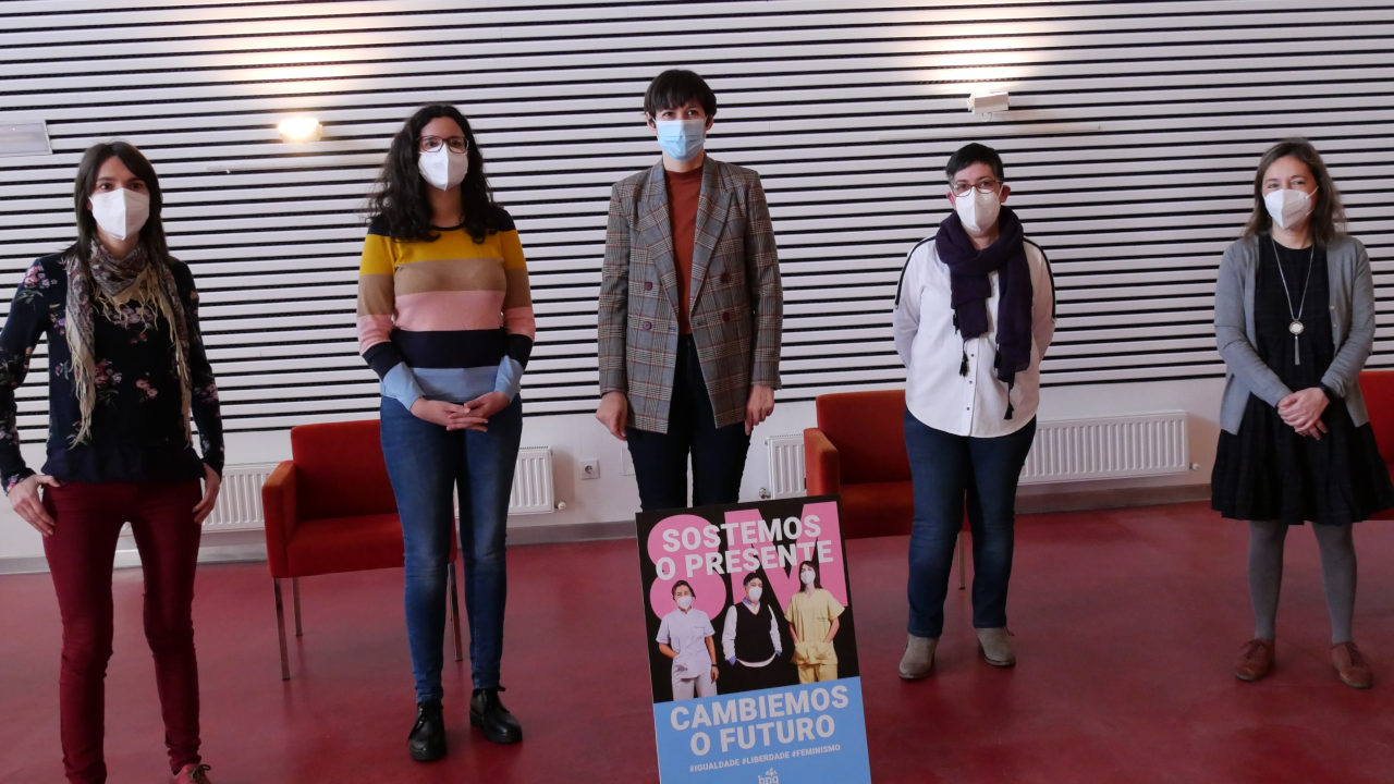 Nun acto acompañada pola deputada e responsable de Acción Feminista da Executiva nacional, Noa Presas, e a participación de Irene Tato, traballadora da sanidade pública, Mercedes Torres, traballadora no sector de alimentación, e Sandra Lado, traballadora dunha residencia de maiores, a portavoz nacionalista, Ana Pontón presentou a campaña do BNG, 8M baixo o lema: Sostemos o presente, cambiemos o futuro. Pontón sinalou que a crise do coronavirus agravou a precariedade laboral das mulleres. «Neste 8-M e ante estes datos que nos demostran que a covid está a supoñer un paso atrás nos dereitos das mulleres e na súa incorporación ao ámbito laboral é fundamental que se poña en marcha un plan de emprego feminino». No caso dos coidados é especialmente grave, recalcou a nacionalista, porque as mulleres “asumiron o rol de coidadoras nesta crise, case sempre de balde, para suplir as carencia no ámbito dos servizos públicos”.