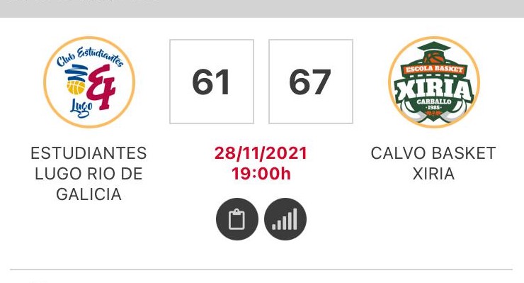 Noqueou este domingo a domicilio ao que era líder da categoría, o Estudantes Lugo, por un resultado de 61-67. Partido xogado no Pazo de Deportes da cidade da Muralla, con parciais de 14-21, 13-18, 20-17 e 14-11, o equipo carballés cultivou un moi bo resultado ante un rival directo a comandar a cabeza da táboa. Cabe destacar a actuación de Pablo López-Pizarro con 19 puntos. Desta forma o Calvo Basket Xiria é segundo na clasificación de Primeira Autonómica – Fase Norte con seis triunfos consecutivos, por detrás do Obradoiro USC.
