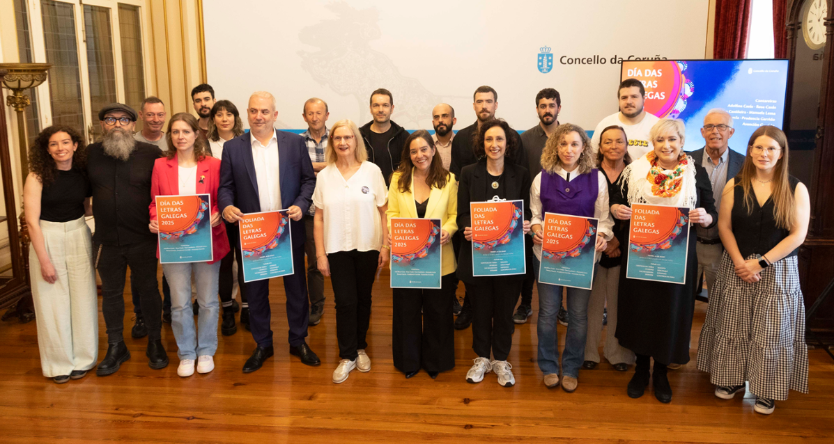 A alcaldesa, Inés Rey, presentou este mércores os actos que o Concello celebrará para conmemorar o Día das Letras Galegas 2025, que este ano está dedicado ás cantareiras e que a Real Academia Galega personificou en sete mulleres: Adolfina Casás, Rosa Casás, Eva Castiñeira, Manuela Lema, Teresa García, Prudencia Garrido e Asunción Garrido. Rey estivo acompañada polo concelleiro de Cultura e Turismo, Gonzalo Castro. Tamén participaron no acto artistas e agrupacións culturais coruñesas que participan no programa.