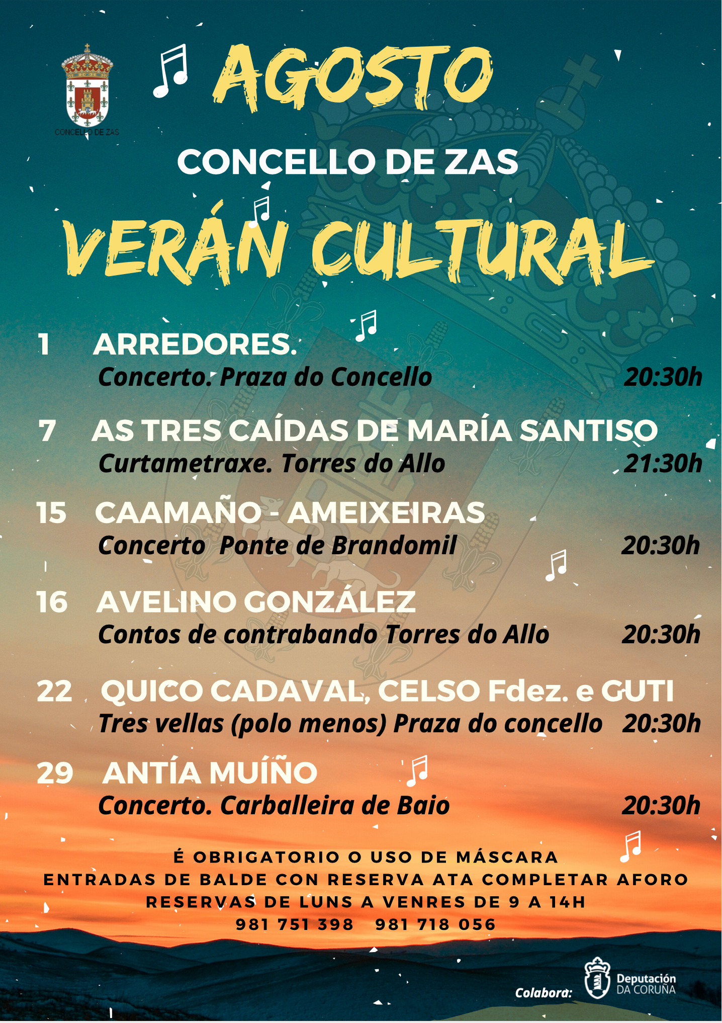 En todos os espectáculos é obrigatorio o uso de máscara e as entradas son de balde con reserva ata completar aforo. As reservas pódense facer de luns a venres en horario de 9:00 a 14:00 horas a través dos números de teléfono 981 751 398 / 981 718 056. Todas as actividades están organizadas polo Concello de Zas en colaboración coa Deputación da Coruña.