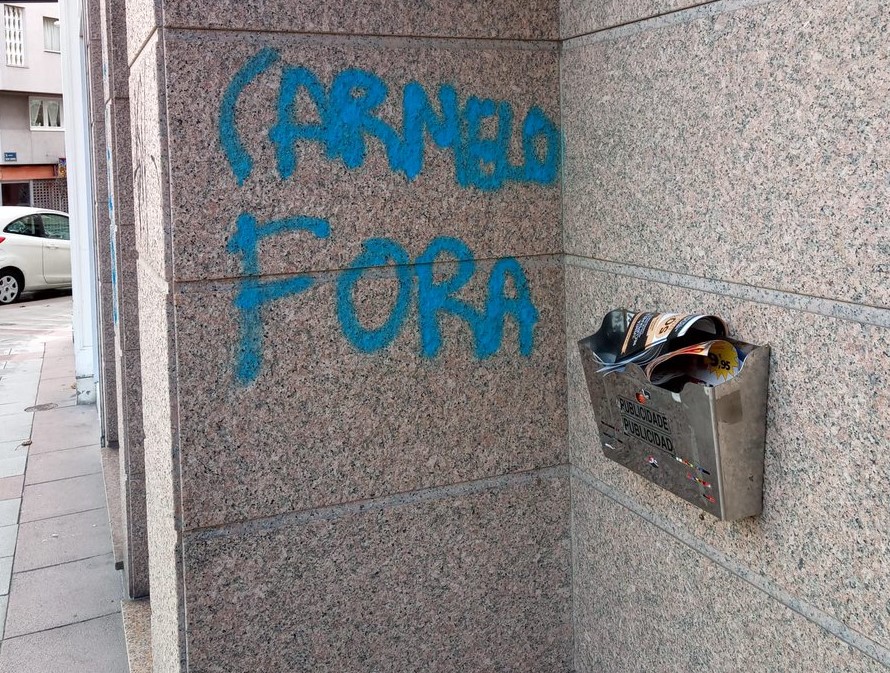 A conta de Twitter ‘@ DEPORSEMPRE1‘ publicou unhas imaxes nas que ven pintadas no portal onde vive Carmelo del Pozo. O director deportivo do conxunto coruñés está no punto de mira, e de feito este domingo eran moitos os que lle pedían que deixase o seu cargo e se marchase do Deportivo. Tanto no portal como nas zonas próximas pódese ler un “Carmelo fóra” e un “ Fóra rata”. Unhas mensaxes similares aos que apareceron no Estadio de Riazor nas últimas horas. A derrota por 2-0 ante o Estremadura foi a pinga que colmou o vaso, sobre todo pola actitude dos futbolistas e a falta de solucións desde os estamentos do club.