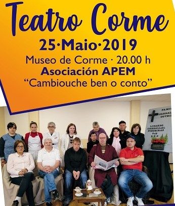 O grupo de teatro da Asociación Pro Enfermos Mentales de Carballo (APEM) visitará Corme o sábado 25, convidado pola Área de Turismo, que dirixe Susana Toja Blanco, para representar a obra “Cambiouche ben o conto”, unha peza escrita e dirixida por varios membros da entidade na que se poñen de manifesto, con certas doses de humor e moita retranca, as reaccións humanas ante un feito inesperado que pode cambiar e empeorar un estilo de vida acomodada.