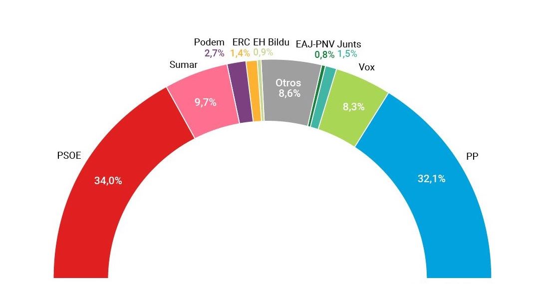 O primeiro CIS de 2024 dá a volta ao escenario político e dispara ao PSOE á primeira posición cunha estimación de voto do 34%. Os socialistas superan en case dous puntos ao PP, que perde un punto desde decembro e retrocede ao segundo posto co 32,1% dos votos. Neste Barómetro de xaneiro, Sumar mantense en terceira forza a pesar de a saída de Podemos, aínda que descende varios puntos e quédase co 9,7% dos apoios. O partido de Ione Belarra, con todo, apenas logra un 2,7% dos votos. Vox, pola súa banda, segue caendo e logra o seu peor resultado da serie histórica co 8,3% dos votos. Outro dato significativo do estudo é que Junts supera a ERC, aínda que o fai por só unha décima. O partido de Puigdemont obtería o 1,5% dos votos fronte ao 1,4% dos republicanos. Respecto aos vascos, EH-Bildu obtería o 0,9% dos votos, dúas décimas menos que en decembro, pero manteríase por diante do PNV, a quen o CIS outorga o 0,8% dos votos (unha décima menos). Pedro Sánchez segue sendo o preferido polos españois para ser presidente do Goberno cun 30,4% dos votos.
