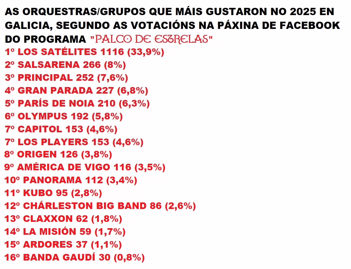 O programa realizaba este 2025 unha enquisa sobre os gustos musicais e escénicos do público que segue a súa páxina de Facebook, na que 17 formacións pasaron a unha final, despois da selección de votacións entre algunhas das festas máis destacadas de Galicia. Foron un total de 3.292 votos, dos cales Los Satélites acadaron o primeiro posto con 1.116, equivalente a un 33,9% do total e moi por encima das outras formacións. Próximamente virán as votacións en directo do programa de radio Palco de Estrelas, no que só se votarán ás formacións galegas.
