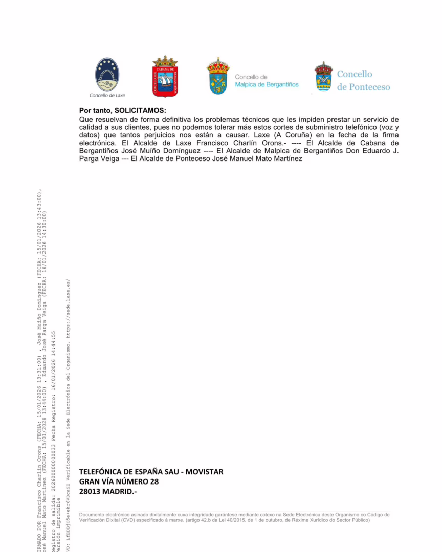 Ante esta realidade, os alcaldes de Laxe, Cabana de Bergantiños, Malpica de Bergantiños e Ponteceso asinaron e rexistraron un escrito conxunto de queixa formal ante a compañía Telefónica de España SAU esixindo unha resposta inmediata e un servizo de telecomunicacións digno e estable, dado que estos cortes están afectando seriamente ao funcionamento das administracións públicas, poñendo en risco prazos administrativos, o traballo do persoal municipal e a atención á cidadanía, conclúen.