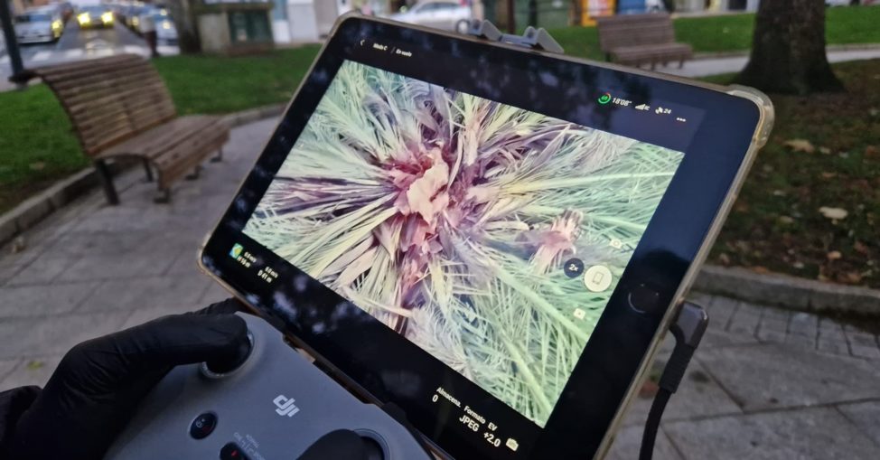 Na inspección realizada con dron detectouse un grave empeoramento da situación da palmeira con respecto ao exame anterior. Nestes momentos xa non ten follas na parte alta e as que conserva están deitadas, síntoma do avance do deterioro. Tampouco hai clorofila, o que non permite a circulación de auga e alimento pola planta, e a desaparición da xema apical, que é o único punto de crecemento da palmeira, implica que xa non xerará novas follas e que as existentes irán desaparecendo.